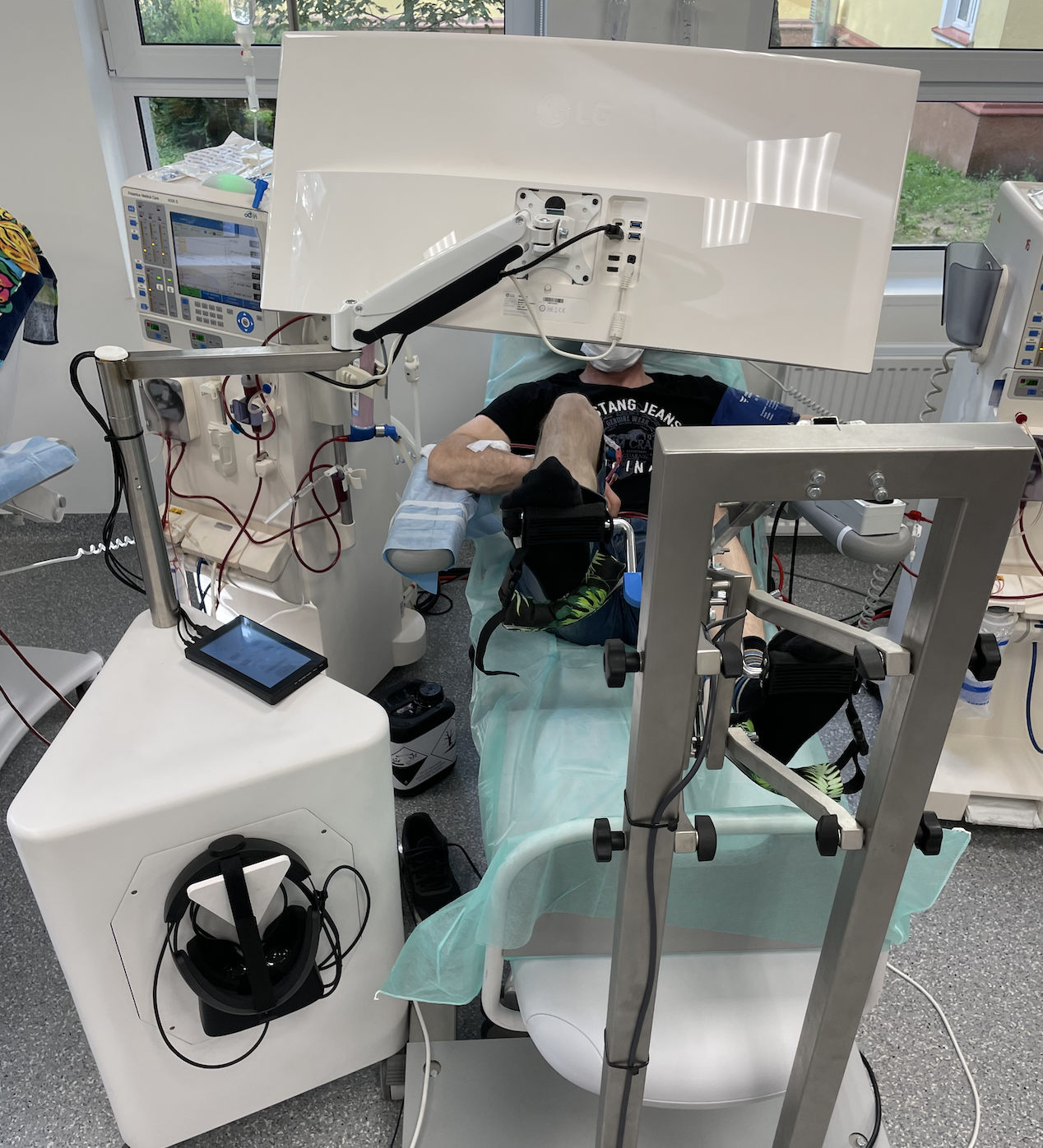 Hemodializa jest procedurą długą, powtarzalną i dla wielu pacjentów obciążającą fizycznie oraz psychicznie. Czas zabiegu bywa odbierany jako czas wyjęty z codziennego życia, a to przekłada się na narastanie znużenia, dyskomfortu i poczucia bierności. Założeniem projektu było stworzenie rozwiązania, które nie tylko odwraca uwagę od trudnego kontekstu szpitalnego, ale również aktywizuje pacjenta w bezpiecznej, kontrolowanej skali.